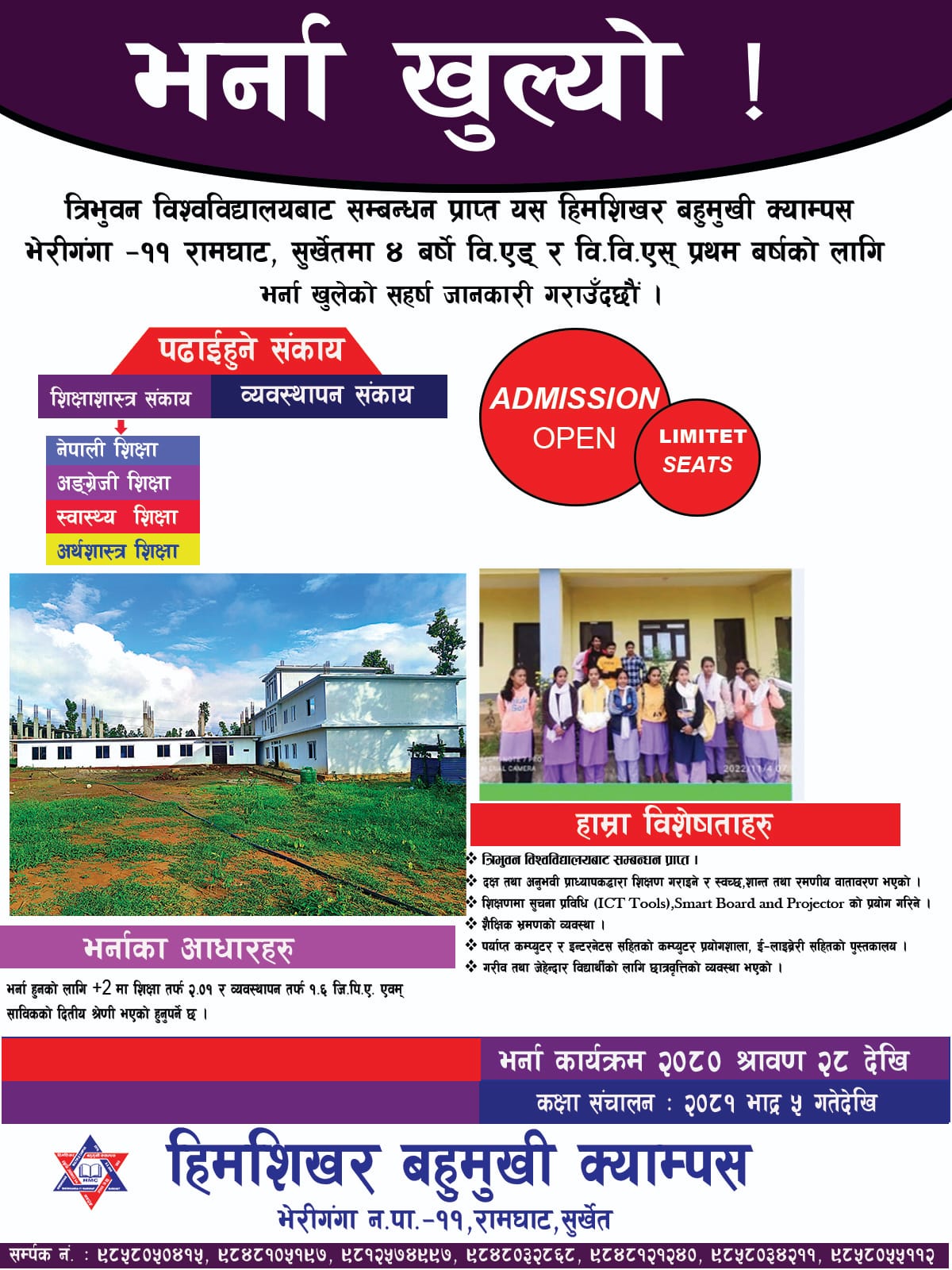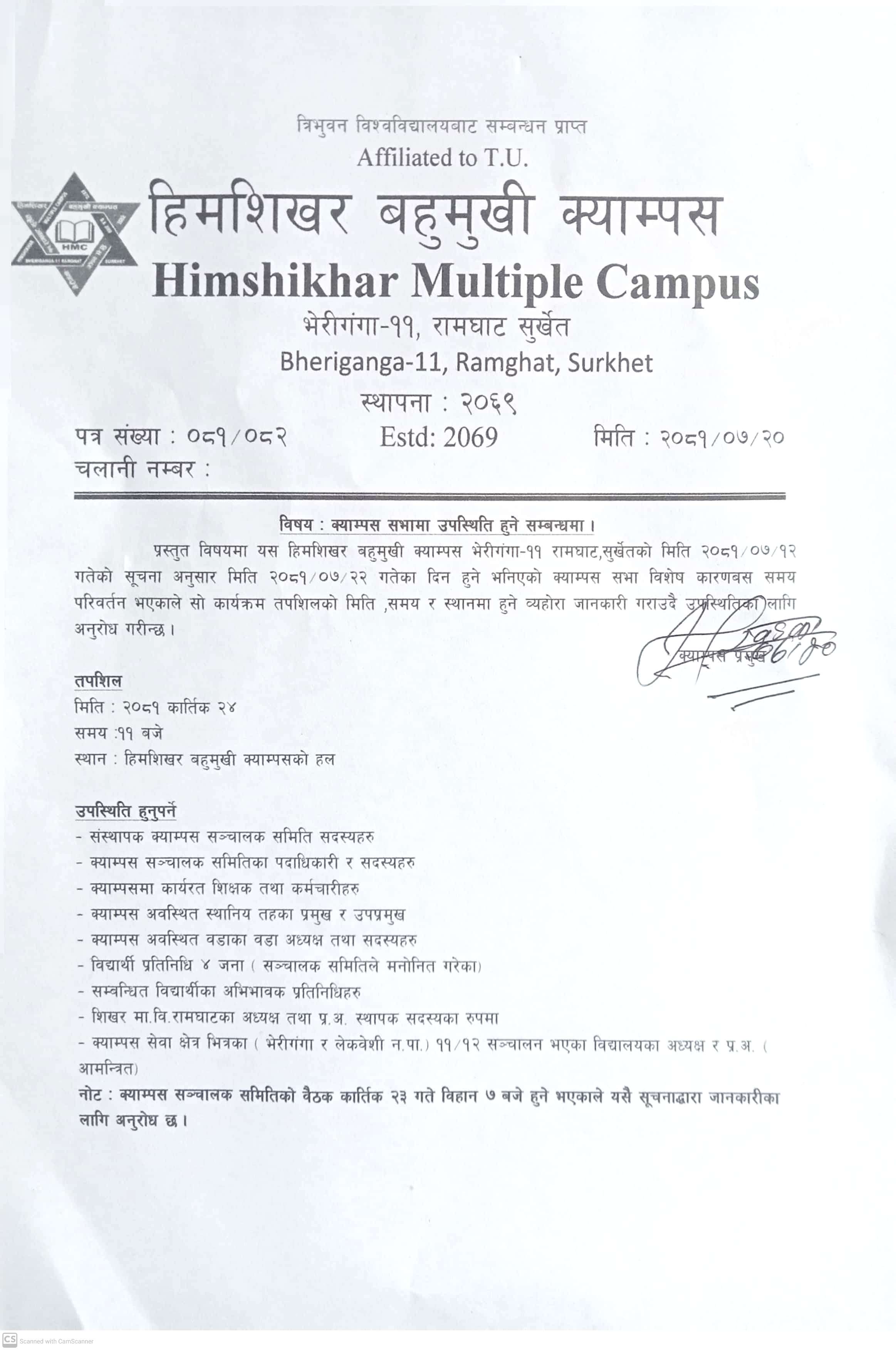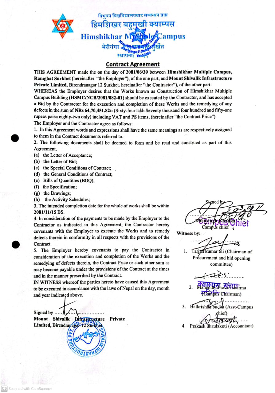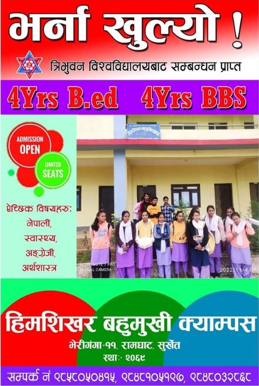 हिमशिखर बहुमुखी क्याम्पस सञ्चालनका लागि तत्कालिन रामघाट गा.वि.स. को २०६७÷०६८ र २०६८÷०६९ को गाउ परिषद्को निर्णयानुसार शिखर मा.वि. रामघाट सुर्खेतको भौतिक संरचना प्रयोग गर्नेगरी र क्याम्पस सञ्चालन सम्बन्धन एवं भौतिक संरचना निर्माणका लागि रु. १०,६३,५९४।२५ रकम क्याम्पसको आधिकारिक सम्बन्धन तथा खाता सञ्चालन नभएको हुँदा शिखर मा.वि. रामघाट मार्फत रु. १,००,०००। पहिलो पटक र रु. १०,३१,०००। गरि जम्मा रु. ११,३१,०००। उक्त विद्यालयबाट प्राप्त भई सोही रकमबाट क्याम्पस सम्बन्धनका लागि धरौटी वापत् साथै अन्य खर्च भएको र सोही अनुसार सम्बन्धनका लागि कार्य प्रक्रिया अगाडि बढाउने क्रममा त्रिभुवन विश्वविद्यालयको २०६९÷४÷१४ को प्राप्त पत्रानुसार सम्बन्धन प्राप्त गरि मिति २०६९÷८÷१७ गते देखि जम्मा ४७ जना विद्यार्थीहरुबाट ३ वर्षे वि. एड्. संकाय सञ्चालन गरि तत्कालिन गाउ शिक्षा समिति रामघाटबाट रु. ५,००,०००। सापटी स्वरुप प्राप्त भई त्रिभुवन विश्वविद्यालयको २०७०÷८÷१९ गतेको प्राप्त पत्रानुसार सम्बन्धन प्राप्त गरि व्यवस्थापन संकायमा २१ जना विद्यार्थीहरुबाट कक्षा सञ्चालन भई हाल दुवै संकाय गरि करिब ५०३ जना विद्यार्थीहरु अध्ययनरत रहेको अवस्था छ भने १९ जना शिक्षक कर्मचारीहरु कार्यरत रहेको अवस्था छ । साथै क्याम्पस शुरुवाती अवस्थामा यस क्याम्पसका विद्यार्थीहरुको पठनपाठनलाई सहजीकरण गर्न लेकवेशी न.पा. वडा नं. ४ बस्ने समाजसेवी श्री तोयानाथ शर्मा को पहलमा उहाँका छोराहरु धनीराम शर्मा र हरिप्रसाद शर्मा को करिब ८४,०००। बराबरका पुस्तकहरु निशुल्क रुपमा उपलब्ध गराई यस क्याम्पसका विद्यार्थीहरुको लागि...