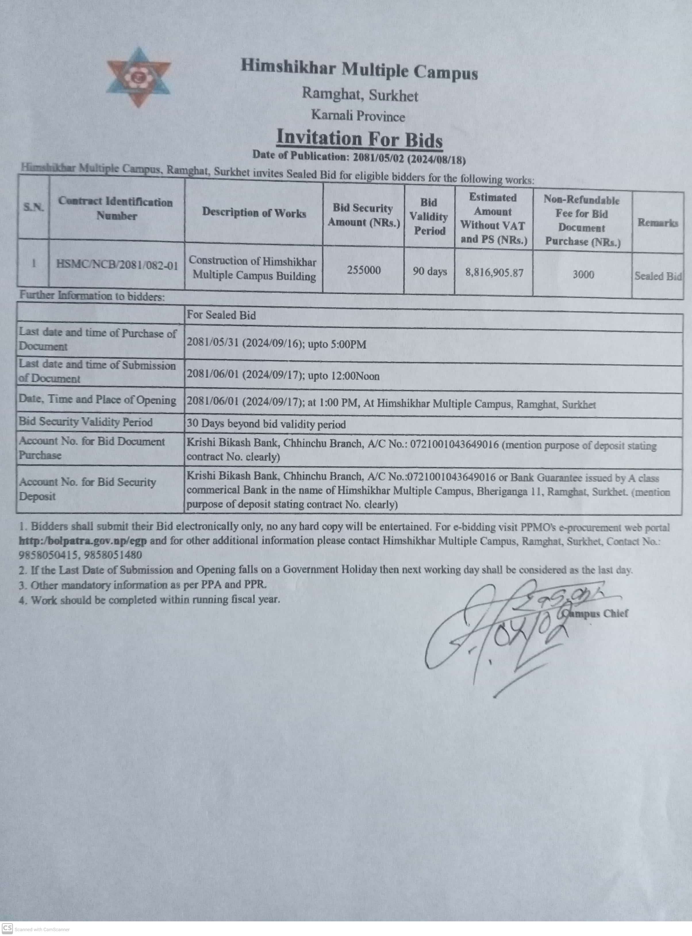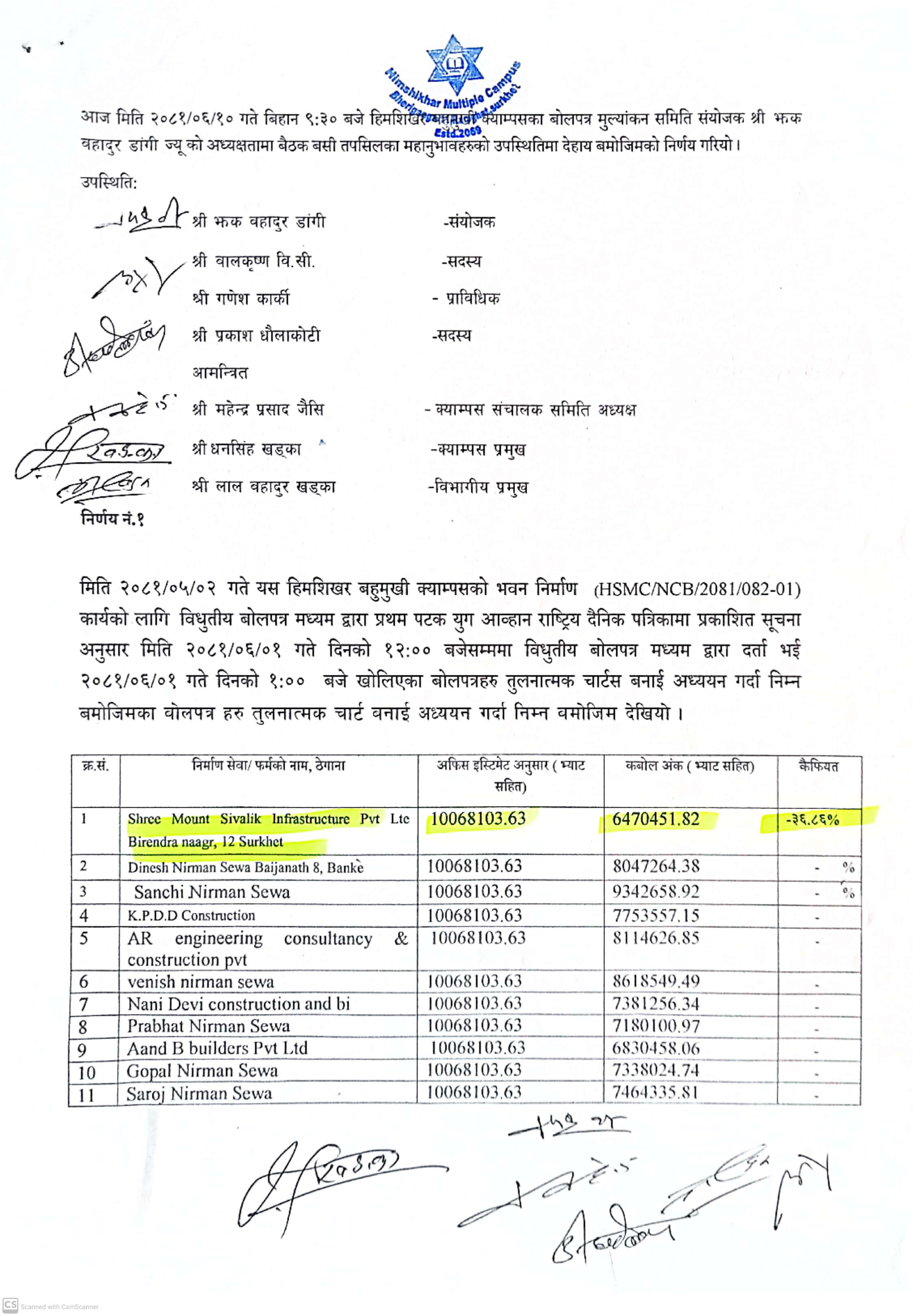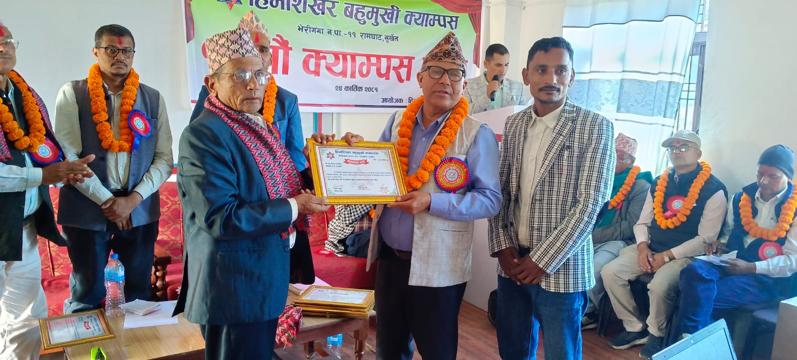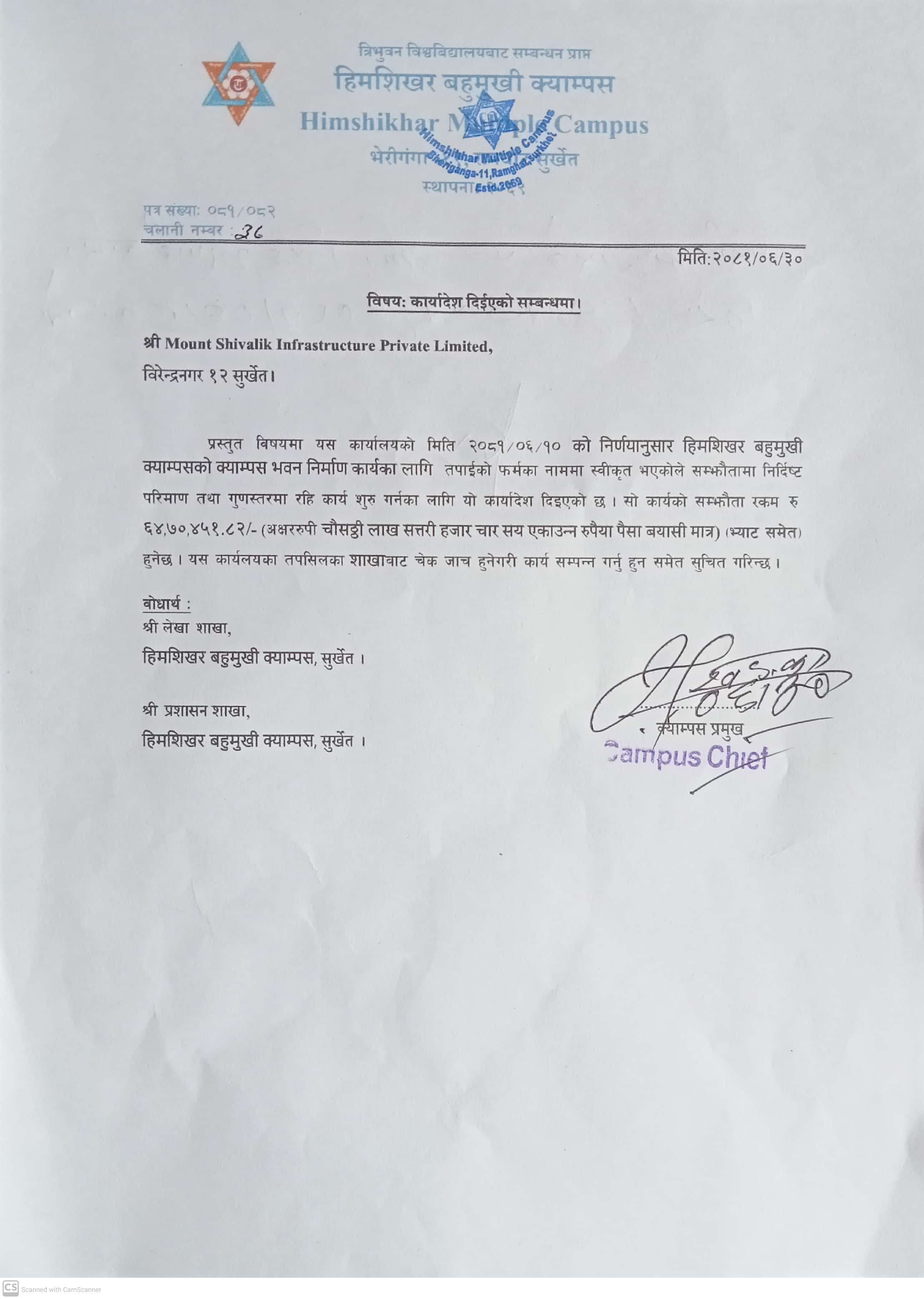 हिमशिखर बहुमुखी क्याम्पस सञ्चालनका लागि तत्कालिन रामघाट गा.वि.स. को २०६७÷०६८ र २०६८÷०६९ को गाउ परिषद्को निर्णयानुसार शिखर मा.वि. रामघाट सुर्खेतको भौतिक संरचना प्रयोग गर्नेगरी र क्याम्पस सञ्चालन सम्बन्धन एवं भौतिक संरचना निर्माणका लागि रु. १०,६३,५९४।२५ रकम क्याम्पसको आधिकारिक सम्बन्धन तथा खाता सञ्चालन नभएको हुँदा शिखर मा.वि. रामघाट मार्फत रु. १,००,०००। पहिलो पटक र रु. १०,३१,०००। गरि जम्मा रु. ११,३१,०००। उक्त विद्यालयबाट प्राप्त भई सोही रकमबाट क्याम्पस सम्बन्धनका लागि धरौटी वापत् साथै अन्य खर्च भएको र सोही अनुसार सम्बन्धनका लागि कार्य प्रक्रिया अगाडि बढाउने क्रममा त्रिभुवन विश्वविद्यालयको २०६९÷४÷१४ को प्राप्त पत्रानुसार सम्बन्धन प्राप्त गरि मिति २०६९÷८÷१७ गते देखि जम्मा ४७ जना विद्यार्थीहरुबाट ३ वर्षे वि. एड्. संकाय सञ्चालन गरि तत्कालिन गाउ शिक्षा समिति रामघाटबाट रु. ५,००,०००। सापटी स्वरुप प्राप्त भई त्रिभुवन विश्वविद्यालयको २०७०÷८÷१९ गतेको प्राप्त पत्रानुसार सम्बन्धन प्राप्त गरि व्यवस्थापन संकायमा २१ जना विद्यार्थीहरुबाट कक्षा सञ्चालन भई हाल दुवै संकाय गरि करिब ५०३ जना विद्यार्थीहरु अध्ययनरत रहेको अवस्था छ भने १९ जना शिक्षक कर्मचारीहरु कार्यरत रहेको अवस्था छ । साथै क्याम्पस शुरुवाती अवस्थामा यस क्याम्पसका विद्यार्थीहरुको पठनपाठनलाई सहजीकरण गर्न लेकवेशी न.पा. वडा नं. ४ बस्ने समाजसेवी श्री तोयानाथ शर्मा को पहलमा उहाँका छोराहरु धनीराम शर्मा र हरिप्रसाद शर्मा को करिब ८४,०००। बराबरका पुस्तकहरु निशुल्क रुपमा उपलब्ध गराई यस क्याम्पसका विद्यार्थीहरुको लागि...